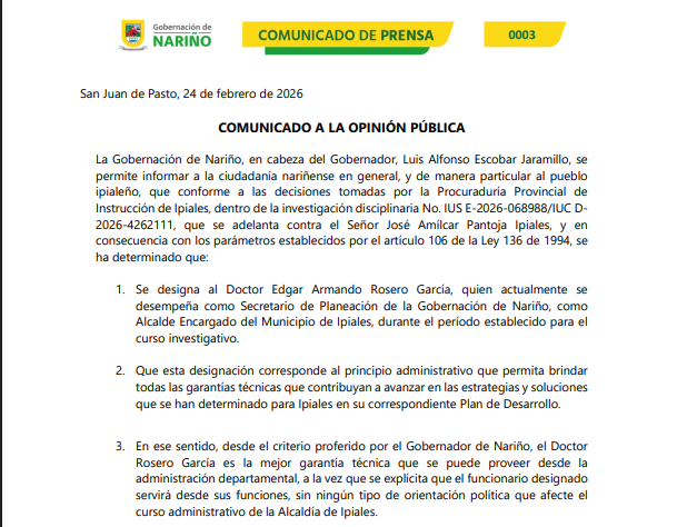 La Gobernación de Nariño, en cabeza del Gobernador, Luis Alfonso Escobar Jaramillo, se permite informar a la ciudadanía nariñense en general, y de manera particular…