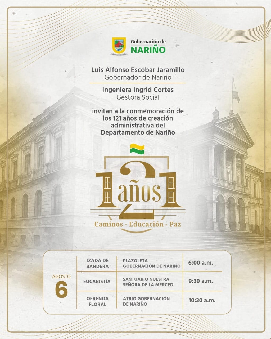 Les reiteramos la invitación para que nos acompañen mañana, miércoles 6 de agosto, en los actos conmemorativos de los 121 años de la creación del Departamento de Nariño; una fecha que nos convoca a honrar nuestra historia y construir, juntos, el futuro de nuestra región.