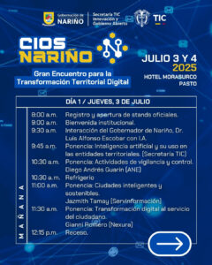 Conoce la agenda del Gran CumbreCIOsNariño 2025. Dos días de ideas, charlas y experiencias que impulsan la transformación digital del territorio.🔰