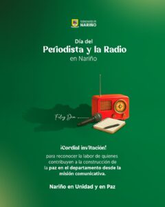 El Gobernador de Nariño, Luis Alfonso Escobar Jaramillo, La Gestora Social, Ingrid Cortes. El Gabinete Departamental. El equipo de trabajo de la Oficina de Prensa y Comunicaciones, tienen el gusto de extender esta invitación para celebrar, reconocer y promover el ejercicio del periodismo, así como para hacer memoria de la huella sonora que la radio deja permanentemente entre las audiencias de Nariño, Colombia y el mundo.