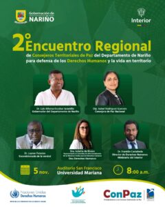 ¡Participa del Encuentro Regional de Consejeros Territoriales de Paz del Departamento de Nariño! un evento crucial para fortalecer la defensa de los Derechos Humanos y la vida en el territorio.