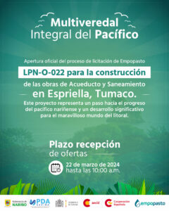 Invitamos a presentar su oferta para la construcción de las obras de Acueducto y Saneamiento en Espriella, Tumaco.