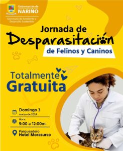 En el marco de la juntanza por la protección y bienestar animal, el programa Protección y Bienestar Animal de la Gobernación de Nariño, invita a toda la ciudadanía a participar de la jornada de desparasitación de felinos y caninos, este domingo 3 de marzo, a partir de las 9:00 a.m. En el parqueadero del Hotel Morasurco.