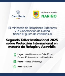 El Ministerio de Relaciones Exteriores y la Gobernación de Nariño, invitan cordialmente a los periodistas de la región al Segundo Taller Institucional sobre Protección Internacional en materia de Refugio y Apátrida.