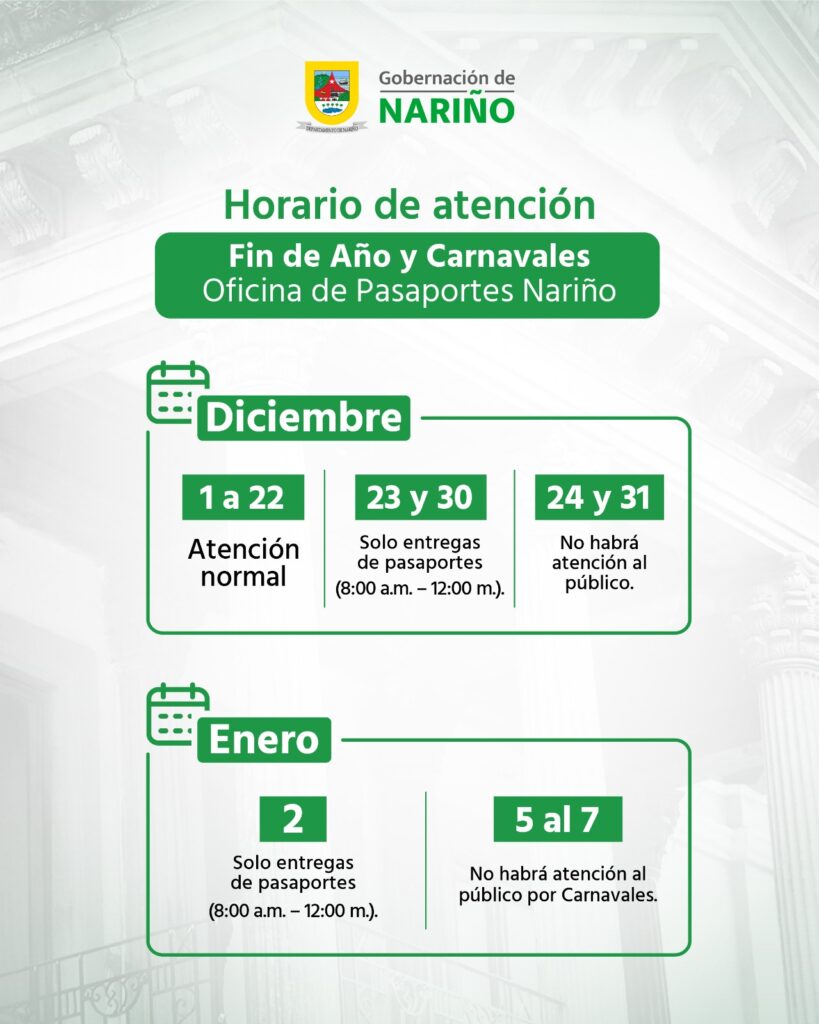 La Oficina de Pasaportes de la Administración Departamental informa a la ciudadanía el horario de atención para las festividades de fin de año y el Carnaval de Negros y Blancos, así como los costos y las etapas del trámite para garantizar un proceso oportuno.