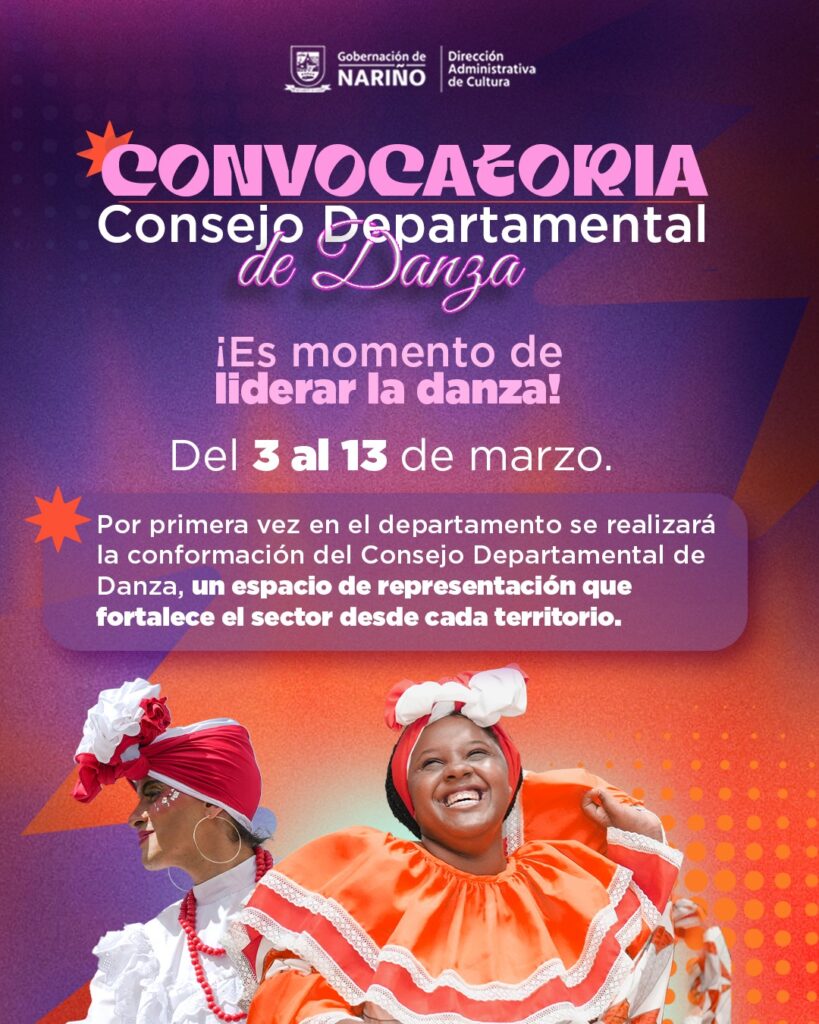 Por primera vez en el departamento se realizará la conformación del Consejo Departamental de Danza, instancia de representación sectorial orientada a impulsar el fortalecimiento y la articulación del ámbito dancístico en los municipios de Nariño. El proceso de inscripción estará habilitado entre el 3 y 13 de marzo en modalidad virtual para integrar este organismo consultivo creado mediante el Decreto 312 del 5 de septiembre de 2025.
